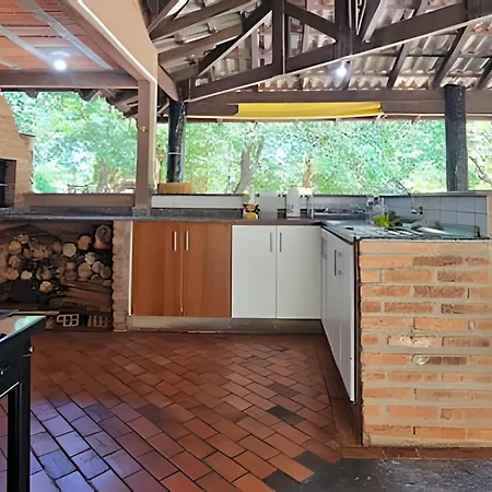 A fully furnished kitchen is part of the amenities available at Charme De Um Tipico Chale De Campo Com Lareira. Villa. - ❓